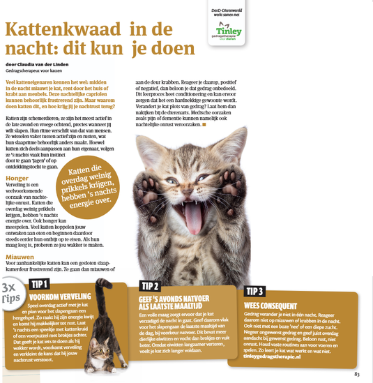 Gedrag verander je niet in één nacht. Reageer niet op miauwen of krabben ’s nachts; ook niet met een boze ‘nee’ of een diepe zucht. Negeer ongewenst gedrag snachts en geef juist overdag aandacht voor gewenst gedrag. Beloon rust en niet onrust. Houd vaste routines aan rondom voeren en spelen. Zo leert je kat wat werkt en wat niet.